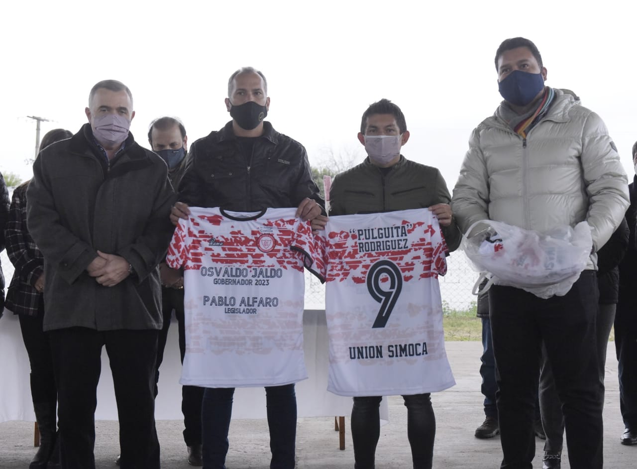 El vicegobernador Osvaldo Jaldo, junto al “pulguita” Rodríguez y acompañado de legisladores, visitaron el club Unión Simoca, donde los recibió su presidente Javier Molina, e hicieron entrega de un subsidio e indumentaria para el equipo que disputa el torneo de ascenso de la liga tucumana.