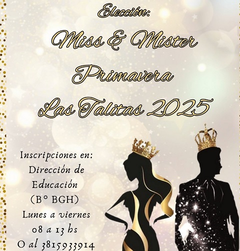 Puede ser una imagen de texto que dice "CARLOS NAJAR MUNICIPIO LAS TALITAS MARTA NAJAR LEGISLADOR ¡Sale elSol! el Sol! INTENDENTE DIRECCION DE EDUCACIÓN Invitan a: Elección: Miss & Mister Primavera Las Talitas 2025 Inscri Inscripciones pciones en: Dirección de Educación (B BGH) Lunes Lunesaviernes a viernes 08a13bs a 13 bs O al 3815933914"