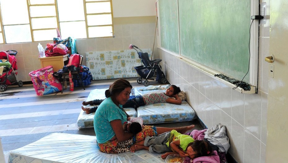 En las escuelas de Aguaray –a 380 kilómetros al norte de Salta capital- todavía no empezaron las clases, pero las aulas están repletas. En lugar de bancos hay colchones y los pupitres son ahora las mesas en donde miles de evacuados comen un guiso de arroz que cinco cocineras prepararon en una olla de un metro de diámetro desde las siete de la mañana. El pizarrón se transformó en un tender donde secar la ropa y justo debajo, tres nenes argentinos que casi no hablan el castellano, duermen acurrucados.