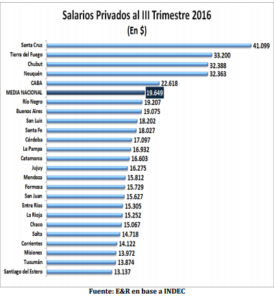 Si se comparan estos niveles con los de la Provincia de mayor salario promedio (Santa Cruz), se tiene que la remuneración promedio santacruceña es 3,13 veces superior a la de la provincia de Tucumán y Santiago.