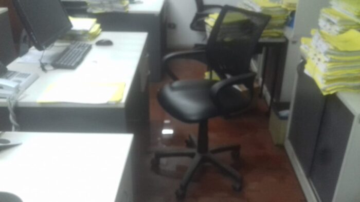 El agua domina el piso de las oficinas y muchos de los elementos se mojaron porque las instalaciones no están en condiciones.
