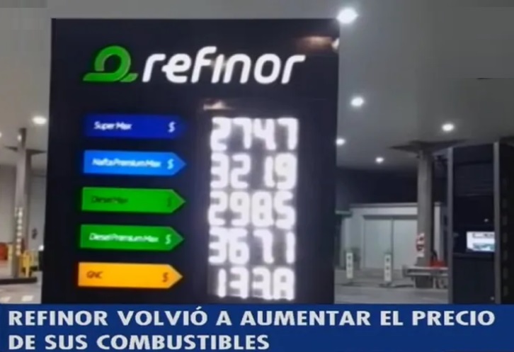 Este jueves, a 24 horas del último aumento, la petrolera regional Refinor volvió a modificar el precio del litro de combustibles. El ajuste más sorpresivo se registró en la Súper Max de un poco más de 10 pesos, de $264,40 pasó a $274,70 (la más cara del mercado).