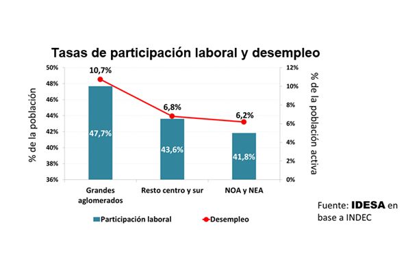 En el resto de las zonas centro y sur la tasa de participación laboral es de 44% y la de desempleo de 7%. Y en NOA y NEA la tasa de participación laboral es de 42% y la de desempleo de 6%.