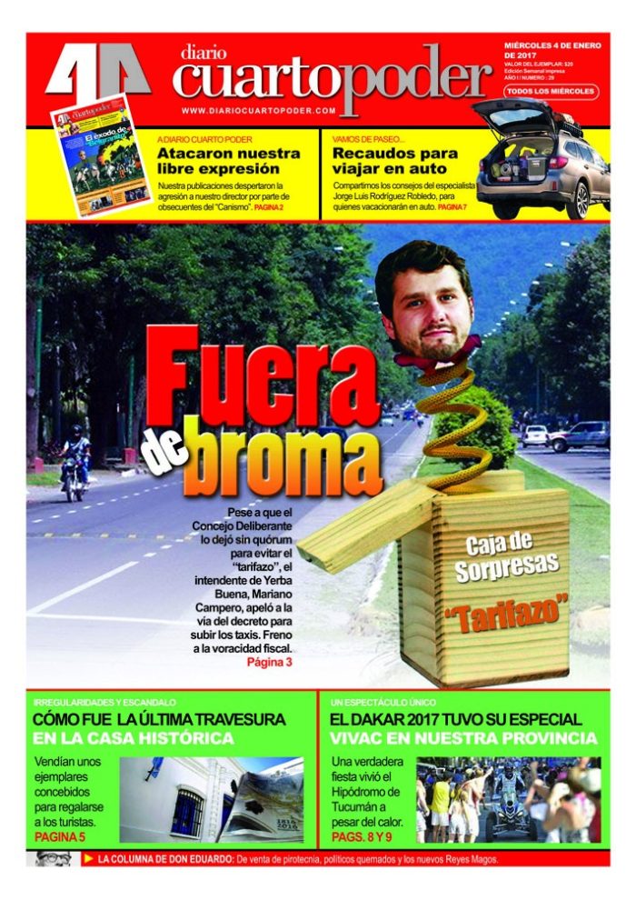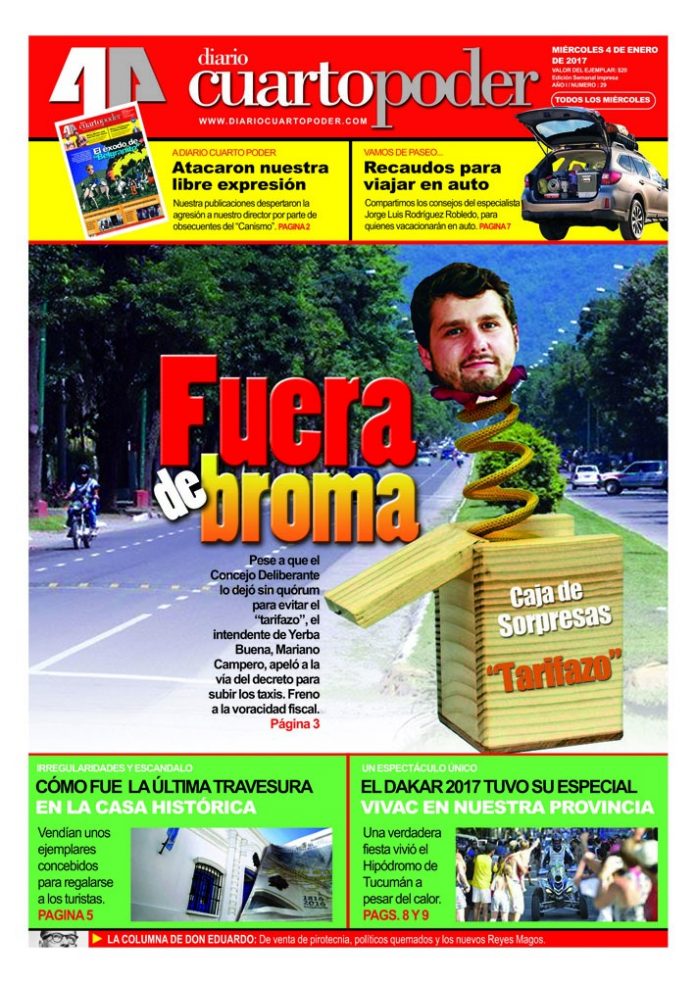 Lo que parecía ser una pesada broma por el Día de los Inocentes, terminó convirtiéndose en una dura realidad. El intendente de Yerba Buena, Mariano Campero, intentó convocar a una sesión extraordinaria para el 28 de diciembre pasado, con el objetivo de prorrogar la vigencia de las ordenanzas Fiscal Anual y el Presupuesto Municipal 2016 e incrementar las tarifas para el servicio de taxis en la “Ciudad Jardín”. Esa movida no le salió al titular del Ejecutivo yerbabuenense, debido a que los concejales no le dieron quórum a la mencionada sesión extraordinaria; sin embargo, Campero no se dejó amilanar en su intención y firmó un decreto para garantizar esos objetivos. Por supuesto que lo rubricó ad referendum del Concejo Deliberante, para cuando se opere el inicio del período ordinario de sesiones o una sesión extraordinaria.