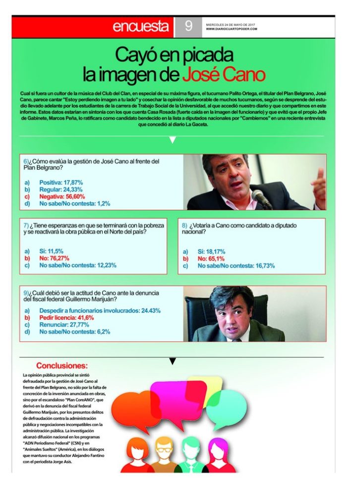 Cual si fuera un cultor de la música del Club del Clan, en especial de su máxima figura, el tucumano Palito Ortega, el titular del Plan Belgrano, José Cano, parece cantar “Estoy perdiendo imagen a tu lado” y cosechar la opinión desfavorable de muchos tucumanos, según se desprende del estudio llevado adelante por los estudiantes de la carrera de Trabajo Social de la Universidad, al que accedió nuestro diario y que compartimos en este informe.