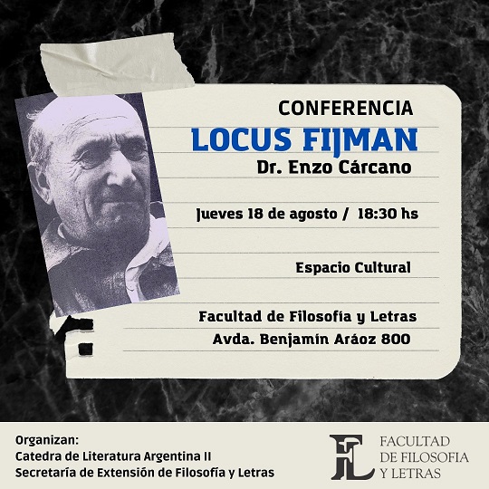 Este jueves, a partir de las 18.30, en el Espacio Cultural de la Facultad de Filosofía y Letras de la Universidad Nacional de Tucumán, el doctor Enzo Cárcano presentará su conferencia “Locus Fijman”, un intento por rescatar la obra de Jacobo Fijman.