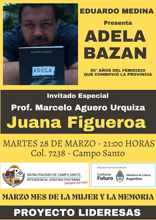 En el marco del Proyecto Liderezas, que busca reivindicar el rol de las mujeres en la historia, el escritor Eduardo Medina, presentará el libro “Adela Bazán”, 90 años del femicidio que conmovió a la provincia de Salta.
