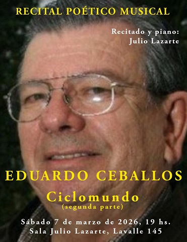 - “Ciclomundo” (Segunda Parte), de Eduardo Ceballos. A las 19, en Sala Lazarte, Lavalle 145 de San Miguel de Tucumán. Recitado y piano: Maestro Julio Lazarte.