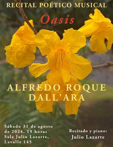 - Sábado 31 de agosto, a las 19, “Oasis”, de Alfredo Roque Dall´ara. Recitado y piano: Julio Lazarte.
