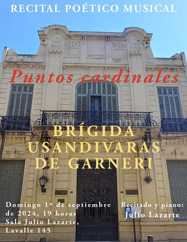 - Domingo 1 de setiembre, a las 19, “Puntos Cardinales”, de Brígida Usandivaras de Garneri. Recitado y piano: Julio Lazarte.