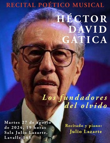- Martes 27 de agosto, a las 19, “Los fundadores del olvido”, de Héctor David Gatica. Recitado y piano: Julio Lazarte.