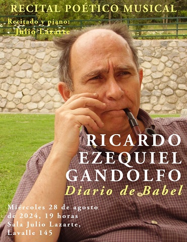 - Miércoles 28 de agosto, a las 19, “Diario de Babel”, de Ricardo Ezequiel Gandolfo. Recitado y piano: Julio Lazarte.