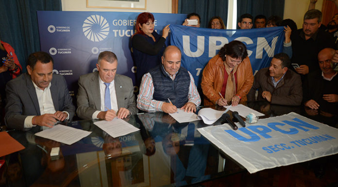 El gobernador Juan Manzur rubricó este mediodía la firma del acta acuerdo con los representantes de la Unión del Personal Civil de la Nación (UPCN) y la Asociación de Trabajadores del Estado (ATE) en la que otorgó un 25% de aumento salarial y la implementación de la cláusula gatillo por inflación para los empleados estatales.