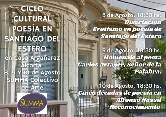 El Ciclo Cultural Poesía en Santiago del Estero en Casa Argañaraz Alcorta, en calle Libertad 175, organizado por SUMMA Colectivo de Arte, reprogramó las tres jornadas de especial significación para la labor y el legado poético de la mencionada provincia.