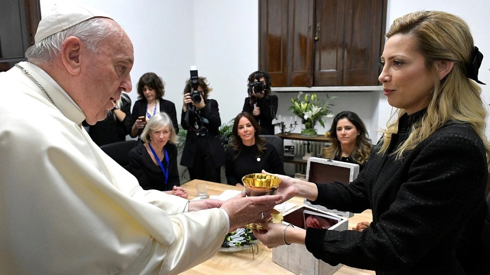 Fabiola Yáñez le regaló al Santo Padre el cáliz que se utilizó en la Misa de la Unión en Luján
