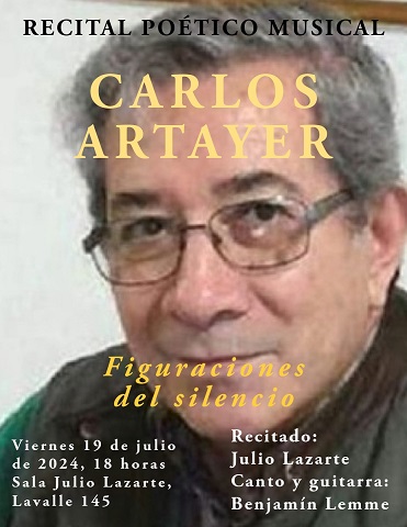En tanto que el viernes 19 de julio está previsto el homenaje al poeta santiagueño Carlos Artayer, recientemente fallecido, con su libro “Figuraciones del silencio”. El recitado estará a cargo del Maestro Julio Lazarte.