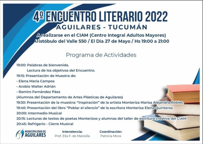 El Centro Integrador de Adultos Mayores (CIAM) de Aguilares, será sede hoy de un nuevo encuentro literario coordinado por Patricia Mora y auspiciado por la Municipalidad de esa ciudad, a través de su intendente Elia Fernández de Mansilla.