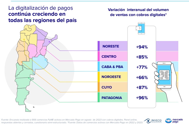 El último informe de “Perspectiva de Comercio Pyme de Mercado Pago” da cuenta de que 9 de cada 10 comercios PyME declara que sus clientes consultan antes de pagar si es posible hacerlo de manera digital, mientras que el 70% del sector resalta que ya menos del 50% de sus ventas se realizan con efectivo. De acuerdo a Mercado Pago, en la región NOA, el volumen de ventas con cobros digitales creció un 66%, respecto al año anterior.