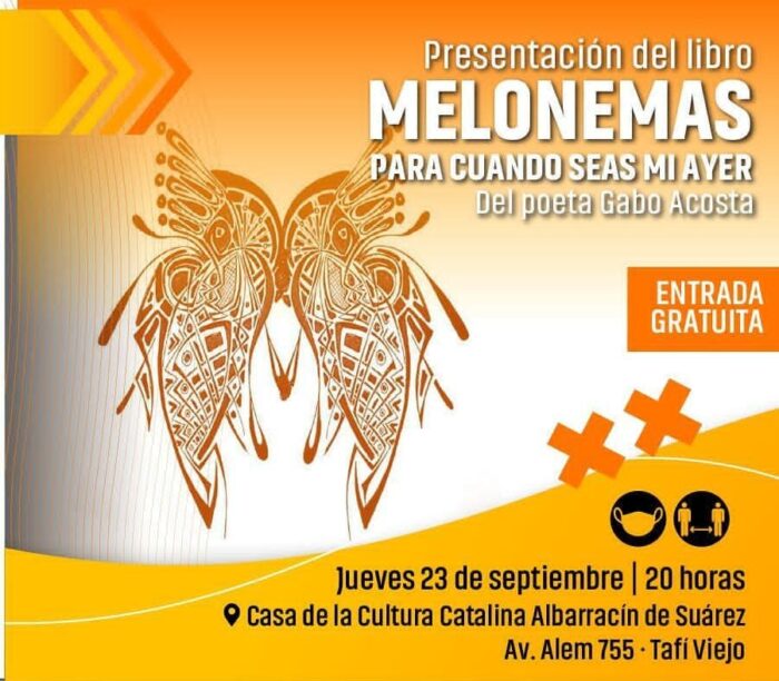 El poeta Gabo Acosta presenta este jueves 23 de septiembre, su nueva obra titulada “Melonemas, para cuando seas mi ayer”, que se realizará en la Casa de la Cultura Albarracín de Suárez, en la ciudad de Tafí Viejo.