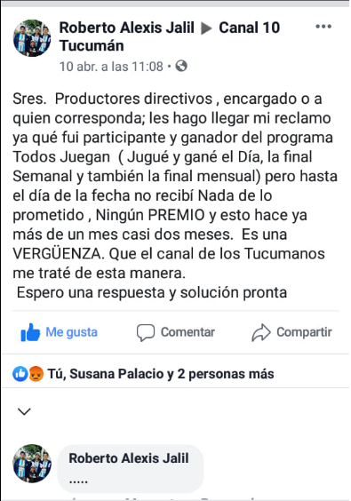 Un tucumano realizó una grave denuncia tras haber sido supuestamente estafado en un programa de Canal 10 donde participó de los juegos y, a pesar de que ganó varias veces, no le dieron ninguno de los premios anunciados: una moto y un televisor LED. Ya pasó un mes y sigue sin respuestas.