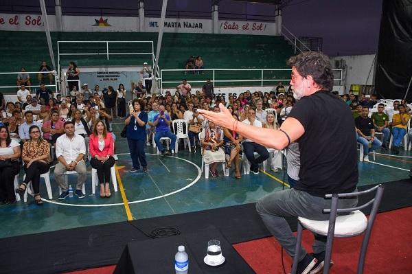 La intendenta de Las Talitas, C.P.N. Marta Najar, junto a los concejales Víctor Safe, Carolina Ortiz, Roberto Martín, Gonzalo Yunoki y Lorena Palomino, recibieron en el complejo municipal Parque Independencia al reconocido actor Gastón Pauls, quien brindó una importante charla sobre prevención de adicciones denominada “HABLEMOS” desde sus vivencias.