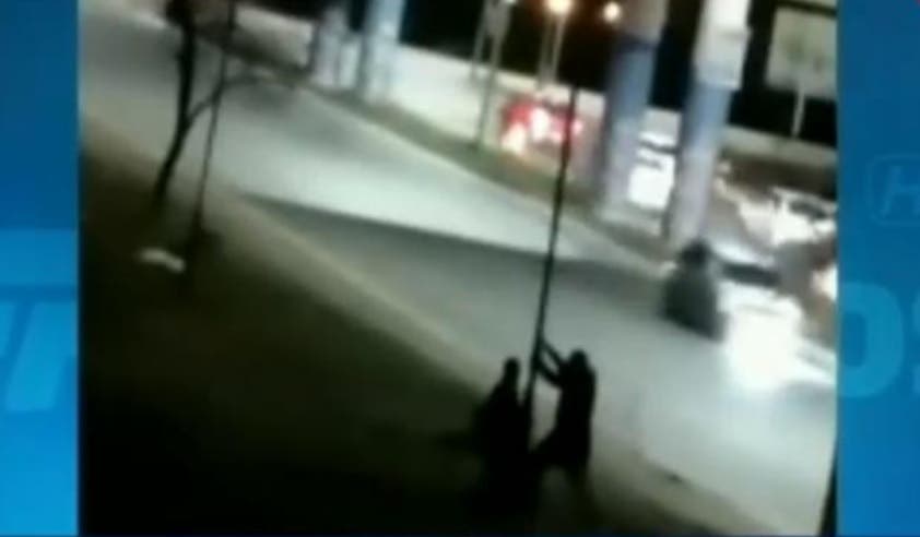 En las imágenes se observa a dos individuos que a fuerza de empujones intentan descalzar las columnas, que habrían robado en horas de la madrugada.