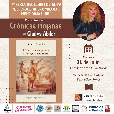 Letras de Fuego / Noticias. La escritora riojana Gladys Abilar presentará su reciente libro “Crónicas riojanas” en la 7ª Feria del Libro de Goya, en la provincia de Corrientes. La cita será este viernes 11 de julio, desde las 14.30, en el Predio Costa Surubí.