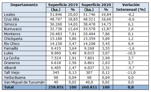 Por otra parte, seis departamentos vieron disminuida su superficie. La reducción de área más significativa se concentra en Lules y Alberdi, donde la situación se explica por el cambio de uso a otros cultivos como soja, citrus y hortalizas.