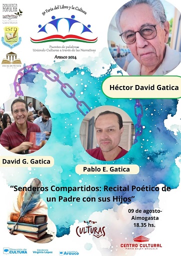 Letras de Fuego / Noticias. El próximo viernes 9 de agosto en el Teatro María Belén Brizuela, de Aimogasta (La Rioja), se presentará “Senderos compartidos: Recital Poético de un Padre y sus Hijos”, con Héctor David Gatica y sus hijos David y Pablo.