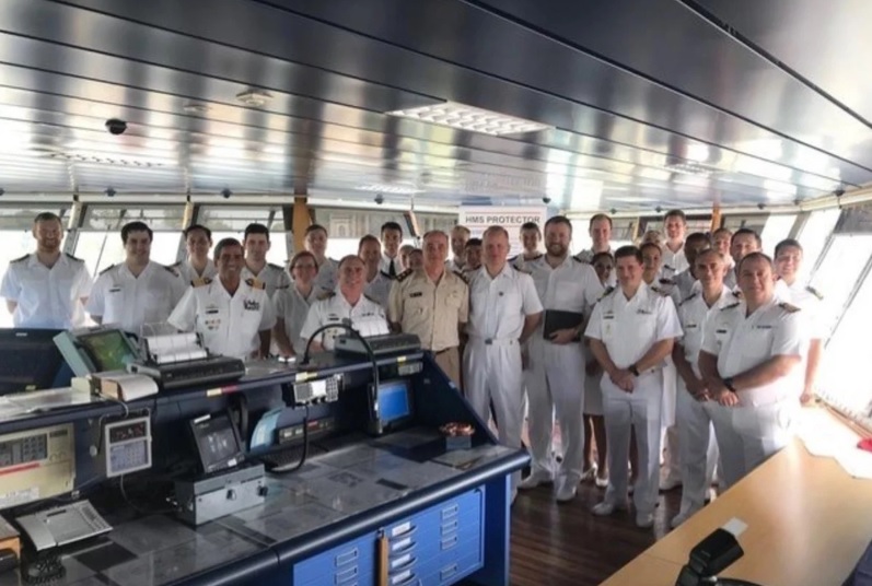 La plana mayor del Irizar a bordo del buque Inglés HSM Protector en el puerto de Buenos Aires, en diciembre, cuando el comandante del buque Matt Syrett hizo entrega del pin del ARA San Juan al COCOANTAR.