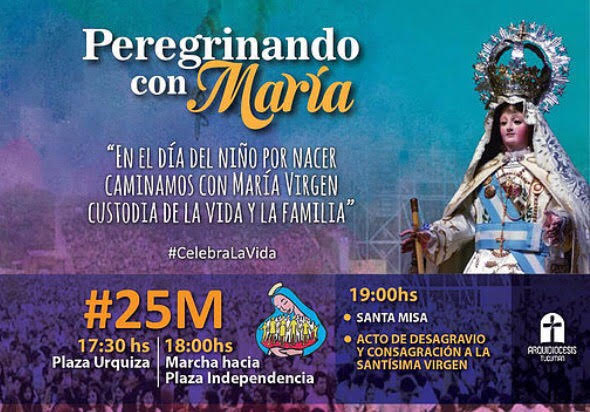 La cita será a las 17.30 en la plaza Urquiza, de 25 de Mayo y avenida Sarmiento, para caminar juntos hacia la Iglesia Catedral donde se celebrará la Santa Misa y se ofrecerá un acto de desagravio a la Virgen María, Custodia de la Vida y la Familia.