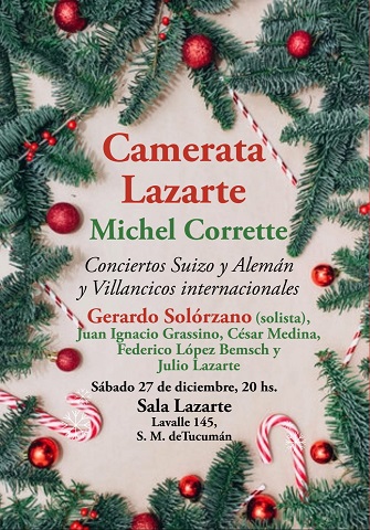 El clima navideño no se agota en estos días en la Sala Lazarte, debido a que la Camerata Lazarte presentará Conciertos Suizo y Alemán, además de villancicos internacionales, según anunció su creador y director, el Maestro Julio Lazarte.