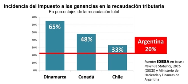 Estos datos muestran que, independientemente del nivel de presión impositiva, los países más ordenados tienden a generar la mayor parte de su recaudación en base al impuesto a las ganancias. Dinamarca es el país con mayor presión impositiva del mundo y dos tercios los recauda con este impuesto. Canadá tiene una presión impositiva similar a la de Argentina y la mitad la obtiene de este impuesto. Chile es uno de los países con menor presión impositiva y un tercio los obtiene con este impuesto. En Argentina, apenas 1 de cada 5 pesos de recaudación proviene del impuesto a las ganancias.