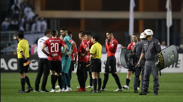 Las bombas de estruendo fueron el comienzo del caos. La bronca acumulada de los simpatizantes se convirtió en una batalla entre la torcida local y la policía. El intento de invasión al campo de juego, los violentos cruces entre los desubicados y los efectivos de seguridad obligaron a la suspensión de un partido en el que no se brindaron garantías. Si bien no es oficial, lo más probable es que la Conmebol sancione al Santos y le de la clasificación a Independiente.