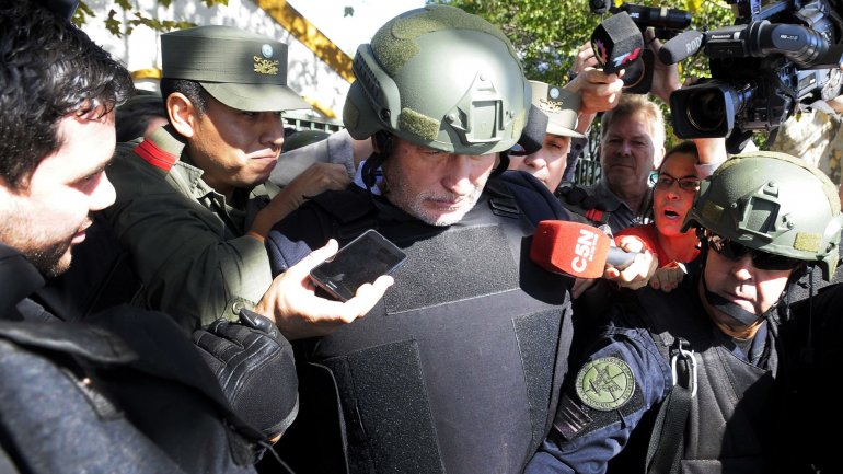 Con chaleco antibalas, esposados con las manos por la espalda y custodia por tres agentes del Servicio Penitenciario Federal (SPF) ingresó a las 12:15 al juzgado de Casanello, en el cuarto piso de los tribunales de Comodoro Py.