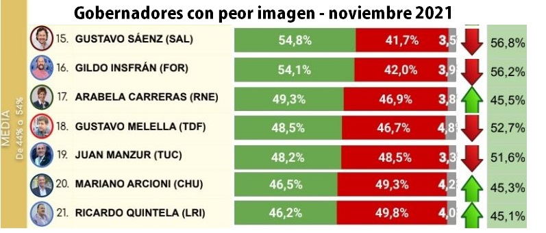 En el fondo de la tabla de imagen negativa de diciembre 2021 aparecen el chubutense Mariano Arcioni (cercano a Massa, 46%), el bonaerense Axel Kicillof (45%), el riojano Ricardo Quintela (43%), la santacruceña Alicia Kirchner (42%) y el santafesino Omar Perotti (42%).