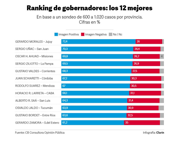 ¿Quién lidera la encuesta? el jujeño Gerardo Morales, después de haberse ubicado durante varios meses entre el medio y el fondo de la tabla, ahora cuenta con un 72% de imagen positiva.