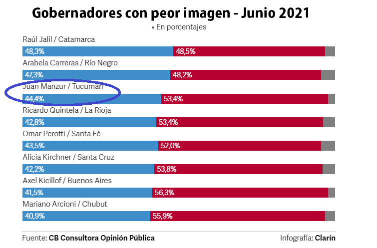 La Consultora CB también midió la imagen pública de los 24 jefes de Gobierno en noviembre 2021 y los peores rankeados fueron en esa oportunidad Alicia Kirchner de Santa Cruz (40% de imagen negativa) Axel Kicillof de Buenos Aires (42,4%), el peronista Omar Perotti de Santa Fe (43,9%) y el gobernador de Tucumán Juan Manzur, de licencia.