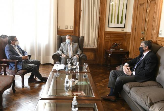 En este marco, el vicegobernador a cargo del Poder Ejecutivo, Osvaldo Jaldo, recibió en Casa de Gobierno al presidente de la Sociedad Rural Tucumán, Sebastián Murga y al ministro de Desarrollo Productivo, Álvaro Simón Padrós. Allí, el mandatario fue invitado por el titular de la SRT al acto lanzamiento de la Expo Rural Tucumán.