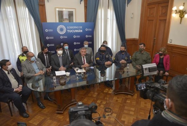 Así lo hizo durante una conferencia de prensa celebrada en Casa de Gobierno, en la que el Mandatario fue acompañado por la secretaria general de la Gobernación, Silvia Pérez; los ministros Eugenio Agüero Gamboa (Seguridad), Eduardo Garvich (Economía), Luis Medina Ruiz (Salud) y Lorena Málaga (Desarrollo Social); el jefe de la Policía de Tucumán, Julio Fernández ; el comisario mayor Walter Bernal, director general de la Agencia Regional Federal NOA-Tucumán; Carlos Marín, comandante segundo y jefe del Escuadrón N° 55 de Gendarmería; el secretario de Estado de Seguridad, Luis Ibáñez; el comisario general Ricardo Fresneda, jefe de la Unidad Regional de la Capital y el comisario, David Domínguez, jefe de la División Unidad Operativa de Investigaciones Especiales de la Policía de Tucumán.