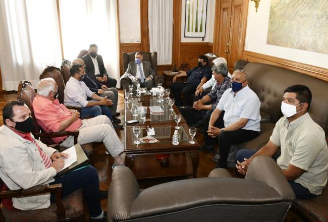 El gobernador, Osvaldo Jaldo, recibió a los representantes sindicales de la producción tucumana Juan Acosta (FEIA), Sebastián Núñez (STIA), Ricardo Ferreyra (UATRE), Luis Sorroza (FOTIA), Enrique Ibarra, Cristian Chávez y Rufino Gerez. En el encuentro, todos expresaron la necesidad de un acuerdo en los montos de los planes inter cosechas.
