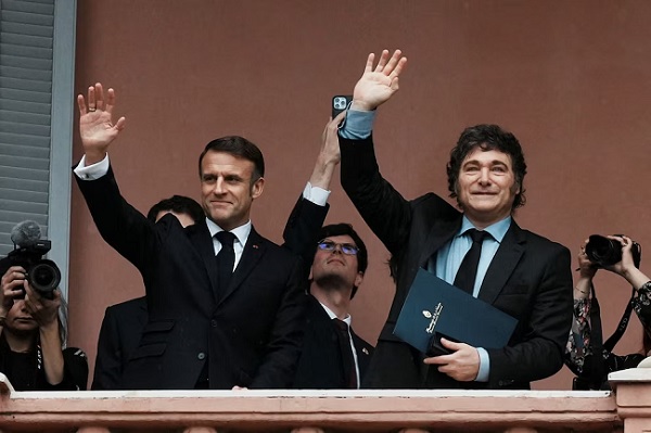 Después de cenar anoche con él en Olivos, el presidente Javier Milei recibió este domingo en la Casa Rosada a su par francés, Emmanuel Macron, con quien mantuvo un encuentro privado de poco más de una hora. Tras el encuentro, ambos mandatarios se asomaron a uno de los balcones de la Casa de Gobierno para saludar al puñado de personas que se encontraba en la vereda bajo una incesante lluvia.