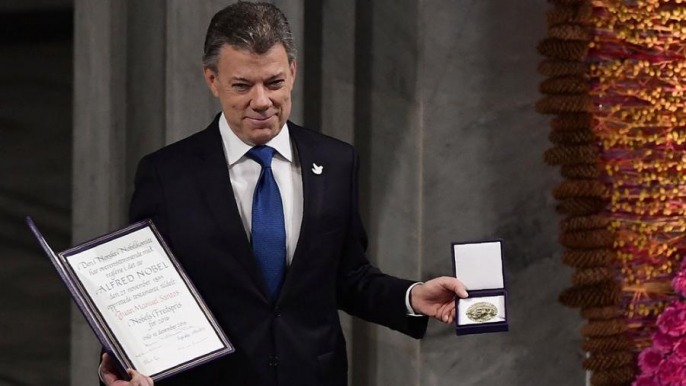 “Hace tan solo seis años, los colombianos no nos atrevíamos a imaginar el final de una guerra que habíamos padecido por medio siglo”, dijo el mandatario en su discurso de agradecimiento, “Casi nadie recordaba cómo era vivir en un país en paz. Pero tras seis años de intensas y difíciles negociaciones, puedo anunciarle al mundo con profunda humildad que el pueblo de Colombia está haciendo posible lo imposible La guerra que causó tanto sufrimiento y angustia a nuestra población ha terminado”.