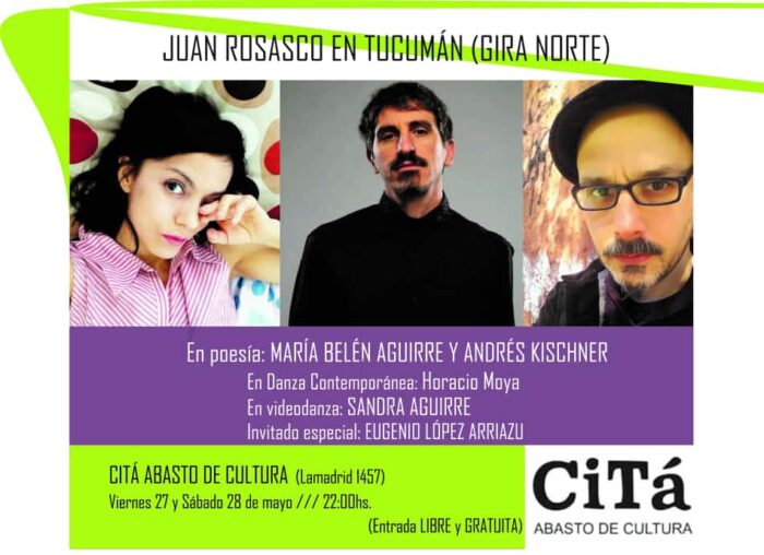 Música y Poesía / Sublime conjunción. Citá Abasto de Cultura albergará las noches de este viernes 27 y sábado 28, la Gira Norte de Juan Rosasco en Banda, quien contará con el aporte poético de María Belén Aguirre y Andrés Kischner, entre otros artistas invitados.