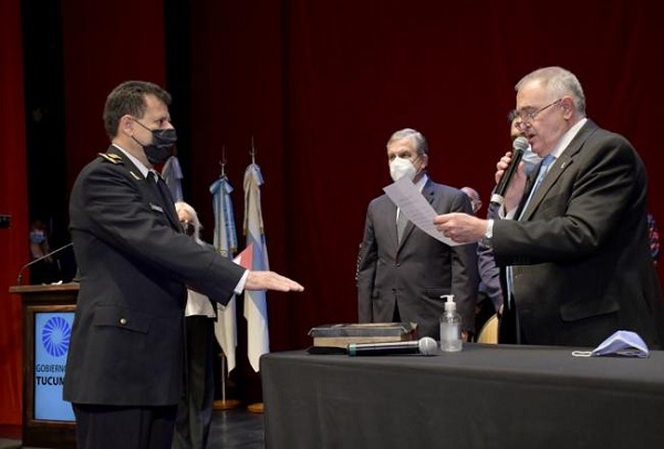 El gobernador Osvaldo Jaldo tomó juramento, este jueves, al nuevo jefe y subjefe de la Policía de Tucumán, Julio Fernández y Sergio Sobrecasas, respectivamente. El acto se realizó en el Teatro Mercedes Sosa.