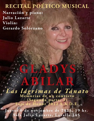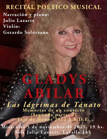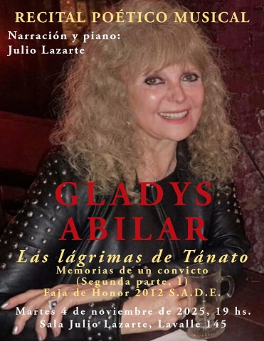 • “Las lágrimas de Tánato”, de Gladys Abilar, a las 19, en Sala Lazarte en Lavalle 145, San Miguel de Tucumán. Narración y piano: Maestro Julio Lazarte.