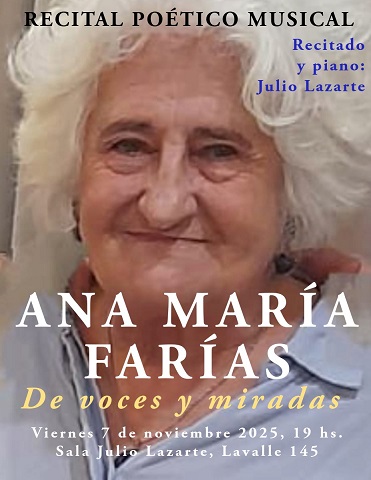 • “De voces y miradas”, de Ana María Farías, a las 19, en Sala Lazarte en Lavalle 145, San Miguel de Tucumán. Recitado y piano: Maestro Julio Lazarte.