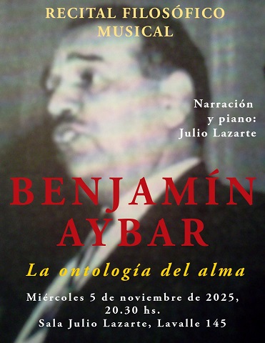 • “La ontología del alma”, de Benjamín Aybar, a las 20.30, en Sala Lazarte en Lavalle 145, San Miguel de Tucumán. Narración y piano: Maestro Julio Lazarte.