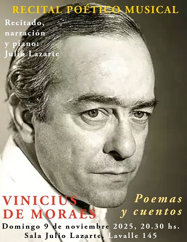 • “Poemas y cuentos”, de Vinicius De Moraes, a las 20.30, en Sala Lazarte en Lavalle 145, San Miguel de Tucumán. Recitado, narración y piano: Maestro Julio Lazarte.