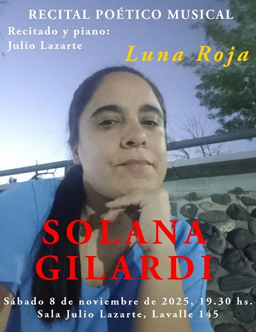 • “Luna roja”, de Solana Gilardi, a las 19, en Sala Lazarte en Lavalle 145, San Miguel de Tucumán. Recitado y piano: Maestro Julio Lazarte.